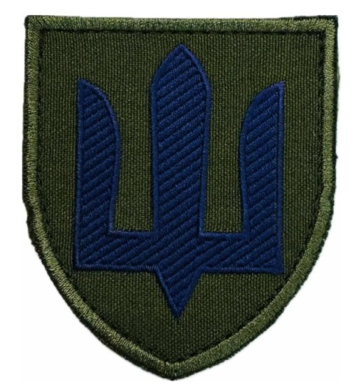 UKW107.Ukrainian sleeve patch of the Territorial Defense Forces Blue Trident on Olive. $9.95