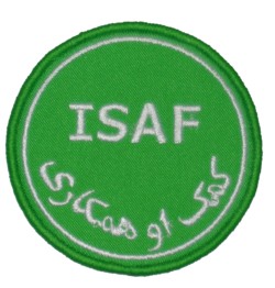 | ISAF2.Sleeve patch for the International Stabilization force in Afghanistan. White English and Arabic script on Green. $6.00 |